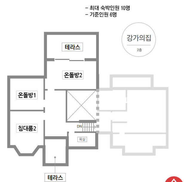 <강가의 집> 1층과 2층 배치도입니다. 공식적으로는 방이 4개(1층 1개/2층 3개)입니다. 최대 인원을 10인으로 설정했지만 단체 행사용 숙박으로 15인에서 20인도 충분히 가능한 규모나 구조입니다. 예약 진행 시 참고하시면 좋을 것 같아요.